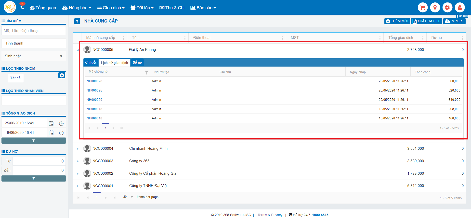 Tại đây, các bạn lựa chọn nhà cung cấp mà bạn muốn xem chi tiết. Tại mục chi tiết, bạn có thể nắm bắt được tên của nhà cung cấp, số điện thoại, email, địa chỉ, tổng số giao dịch, dư nợ....