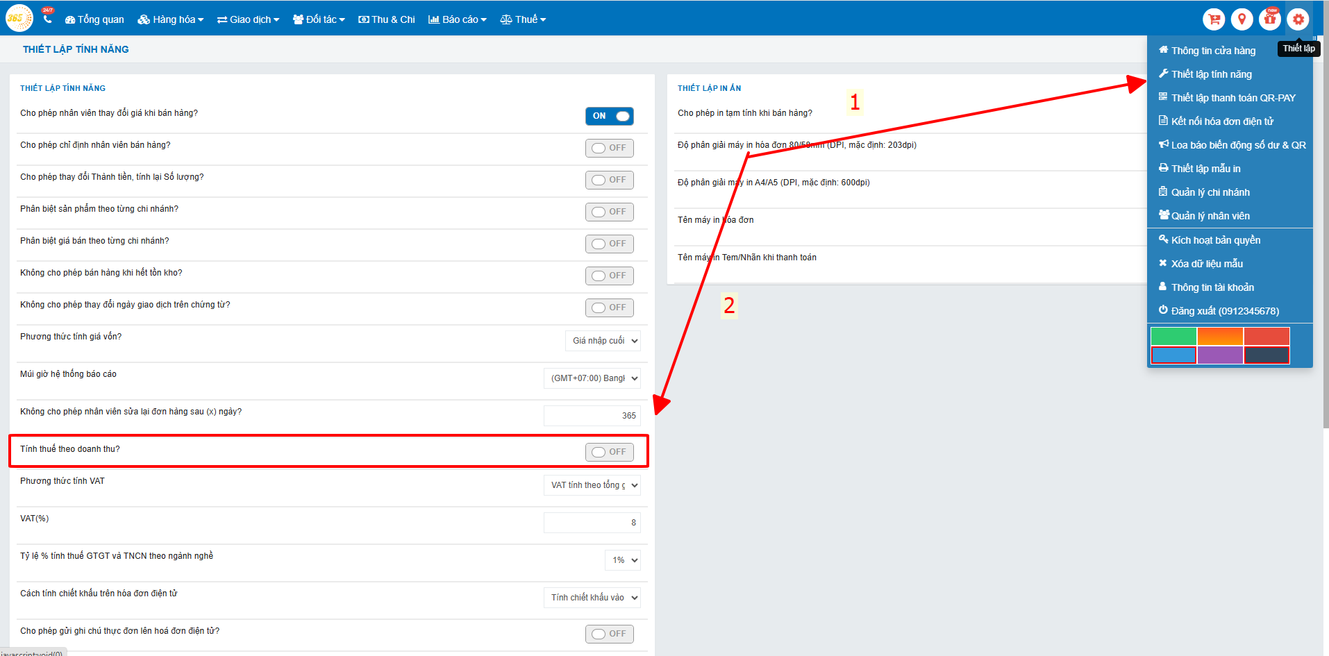 1. Bật chế độ tính thuế theo doanh thu
