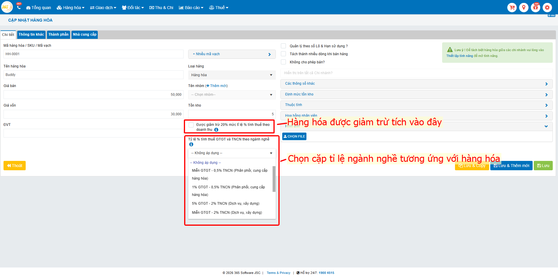 Chọn bổ sung cặp tỷ lệ thuế TNCN, GTGT và đánh dấu giảm trừ nếu có của từng hàng hóa ở menu Hàng hóa → Sửa thủ công hoặc export/import lại file