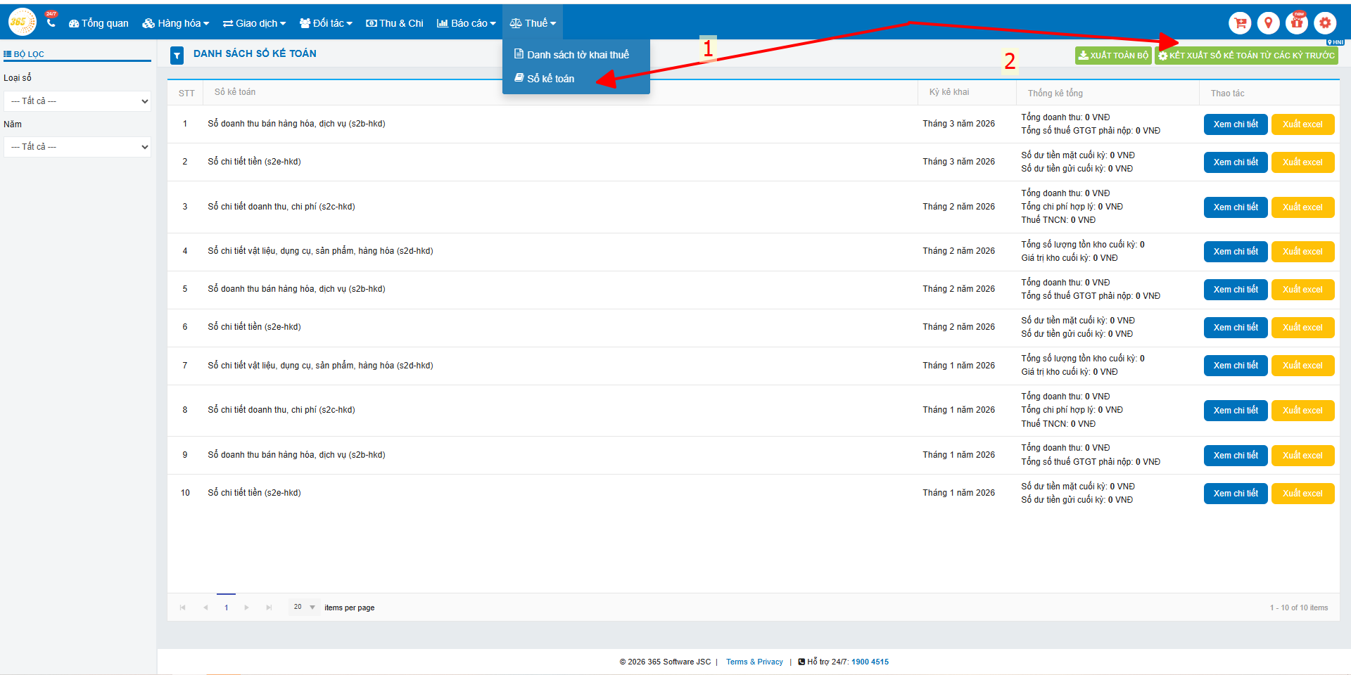 - Kết xuất sổ kế toán của các kỳ trước (tháng/quý tùy hình thức kê khai)