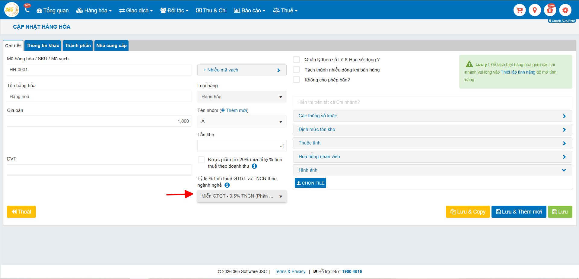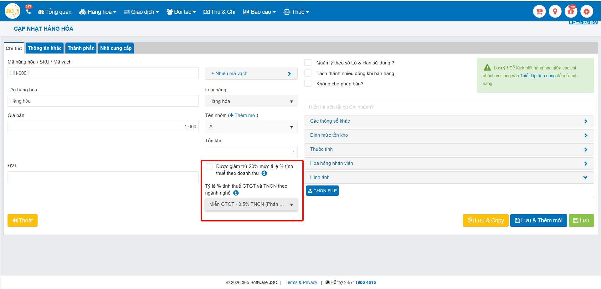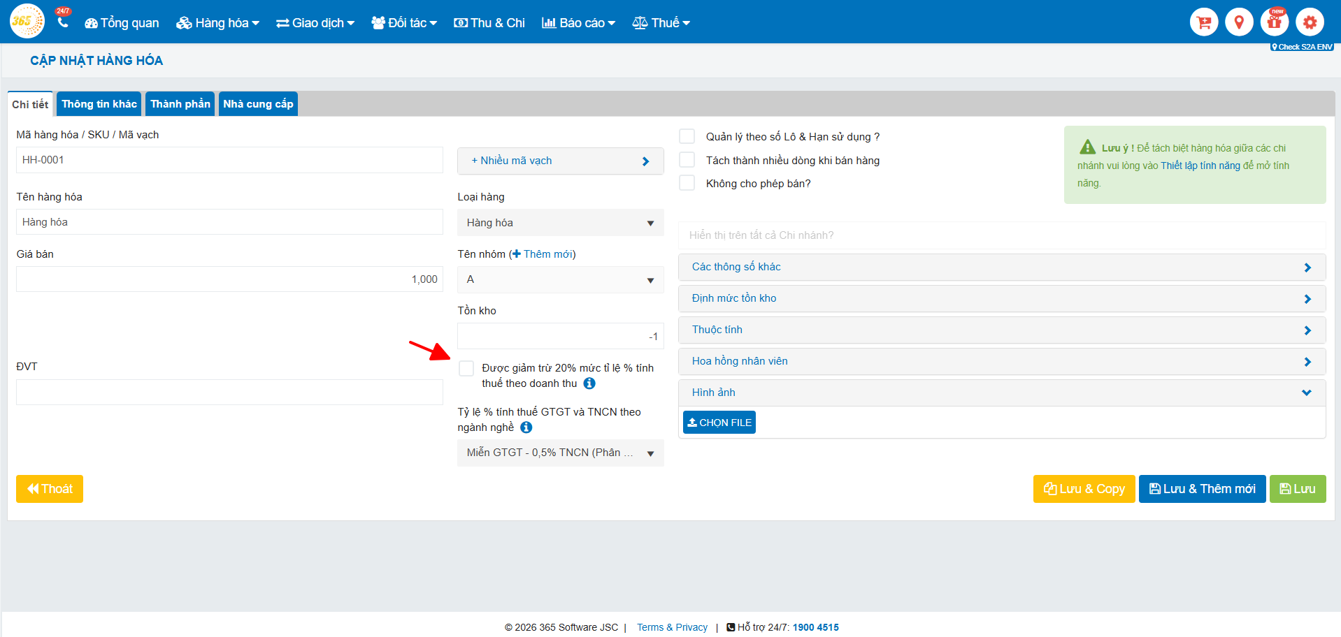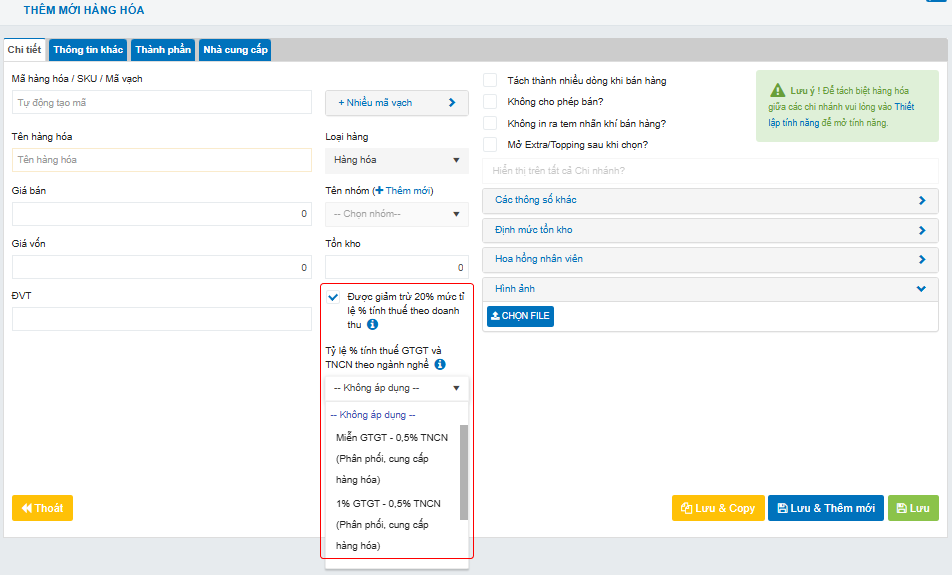 Thêm đánh đánh dấu “Được giảm trừ 20% mức tỉ lệ % tính thuế theo doanh thu” → Nếu hàng hóa được giảm thì tích chọn vào còn ngược lại thì không.