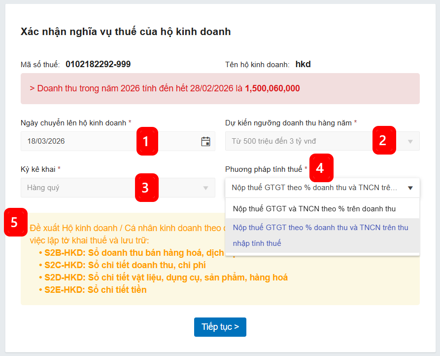 - Phương pháp tính thuế: Hiển thị tương ứng dựa ngưỡng doanh thu đã xác định, với ngưỡng doanh thu từ 500 triệu đến 3 tỉ thì HKD sẽ lựa chọn 1 trong 2 phương pháp tính thuế (tính thuế theo doanh thu hoặc khấu trừ)