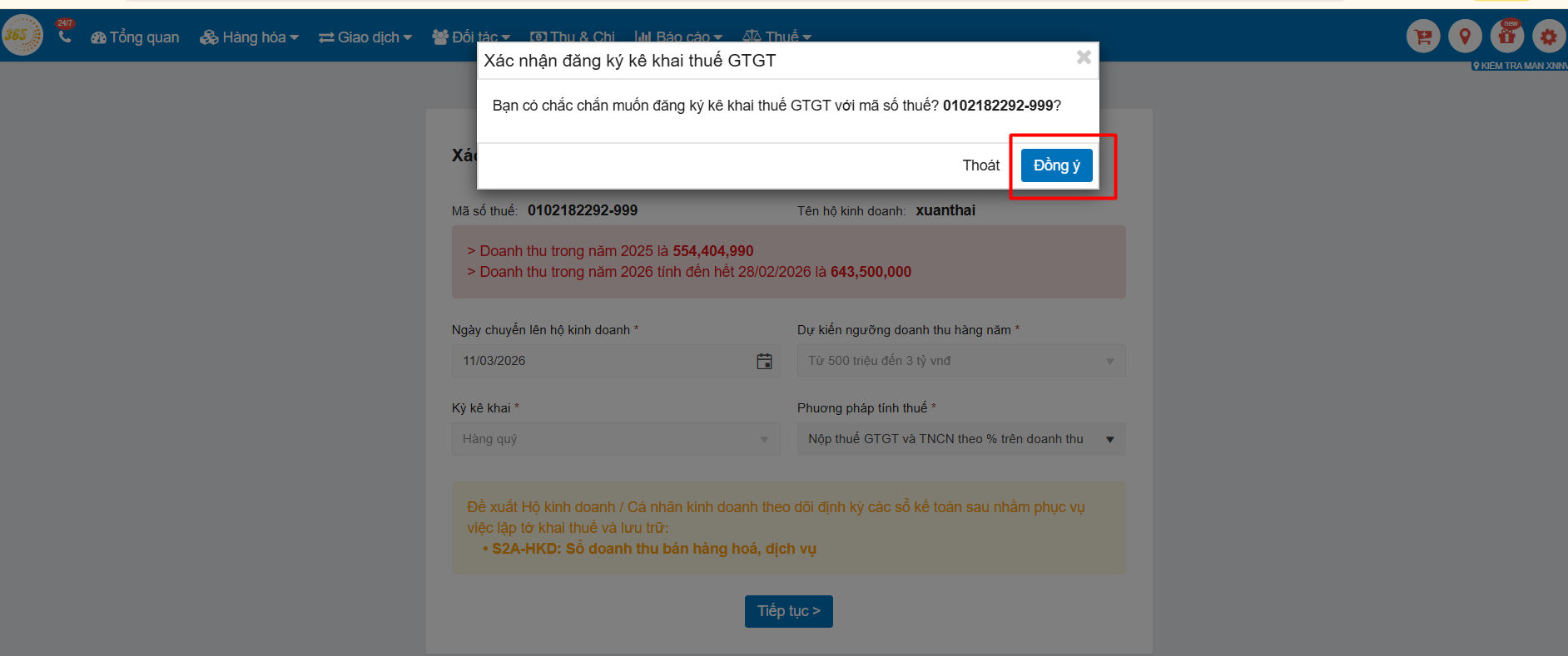 Bước 4: Sau khi xác nhận thông tin đều đúng, Người dùng nhấn nút Tiếp tục → chọn Đồng ý để hoàn thành màn xác nhận nghĩa vụ thuế với hộ kinh doanh.