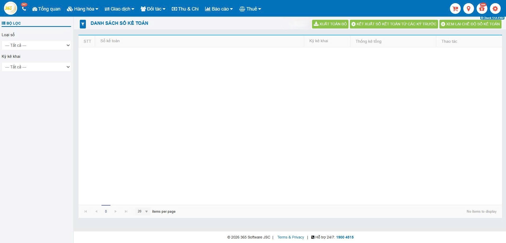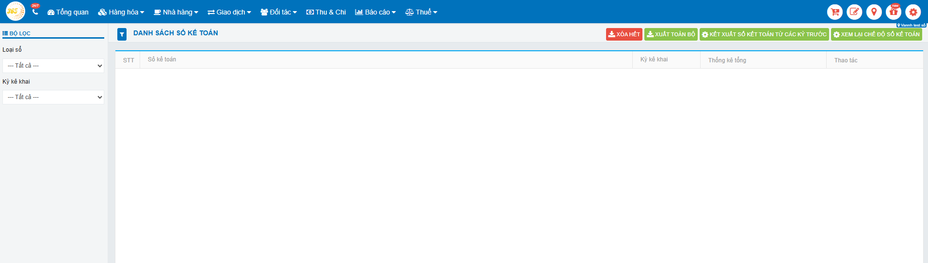Hệ thống POS365 sẽ hiển thị màn hình Danh sách sổ kế toán, bao gồm: