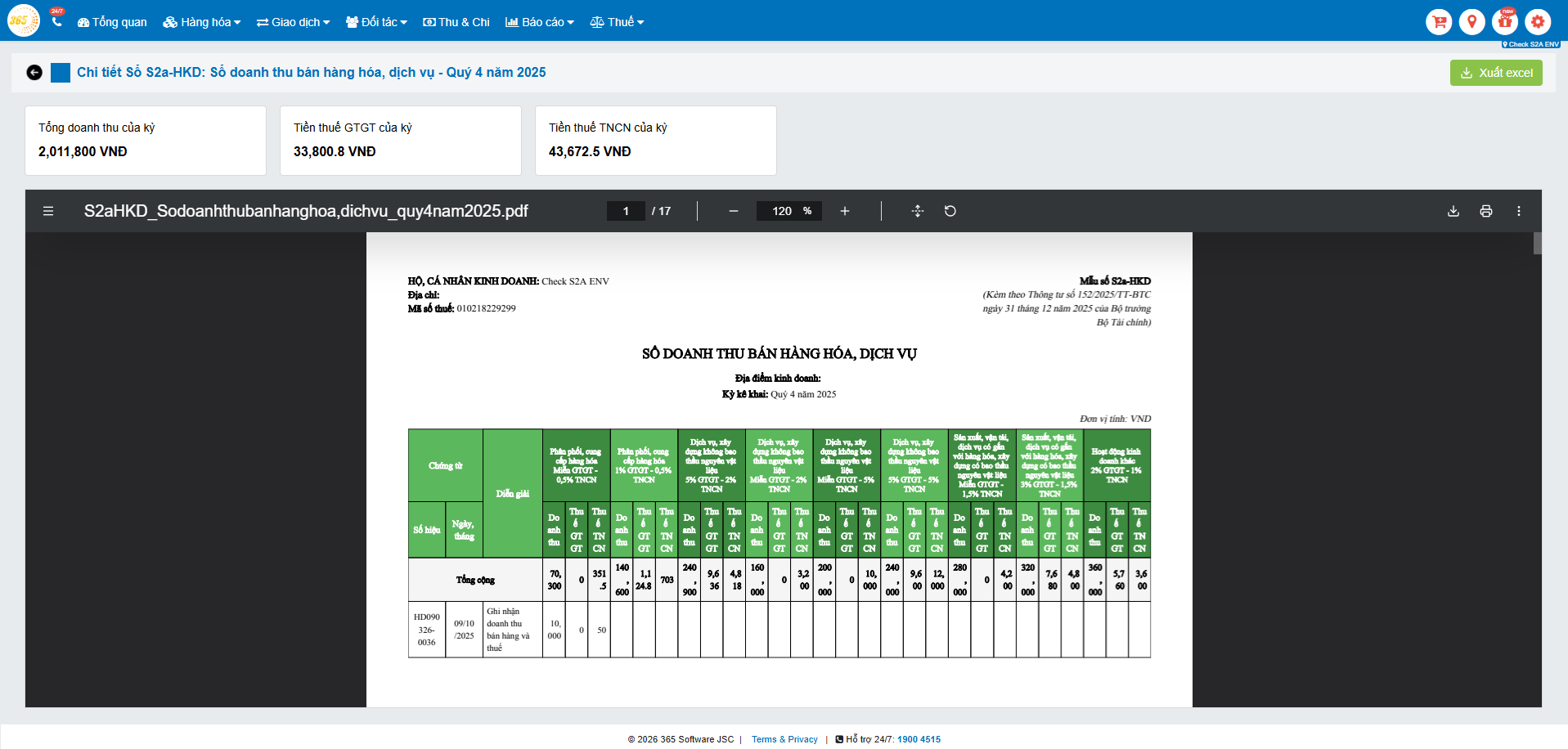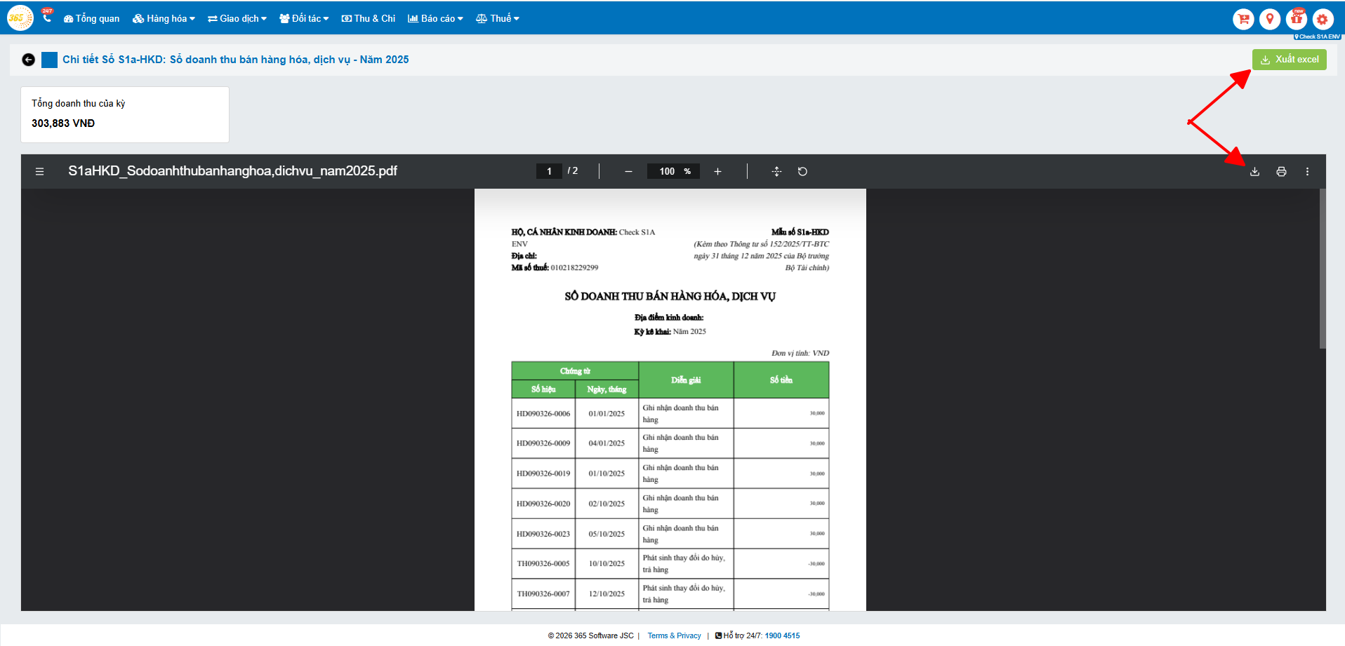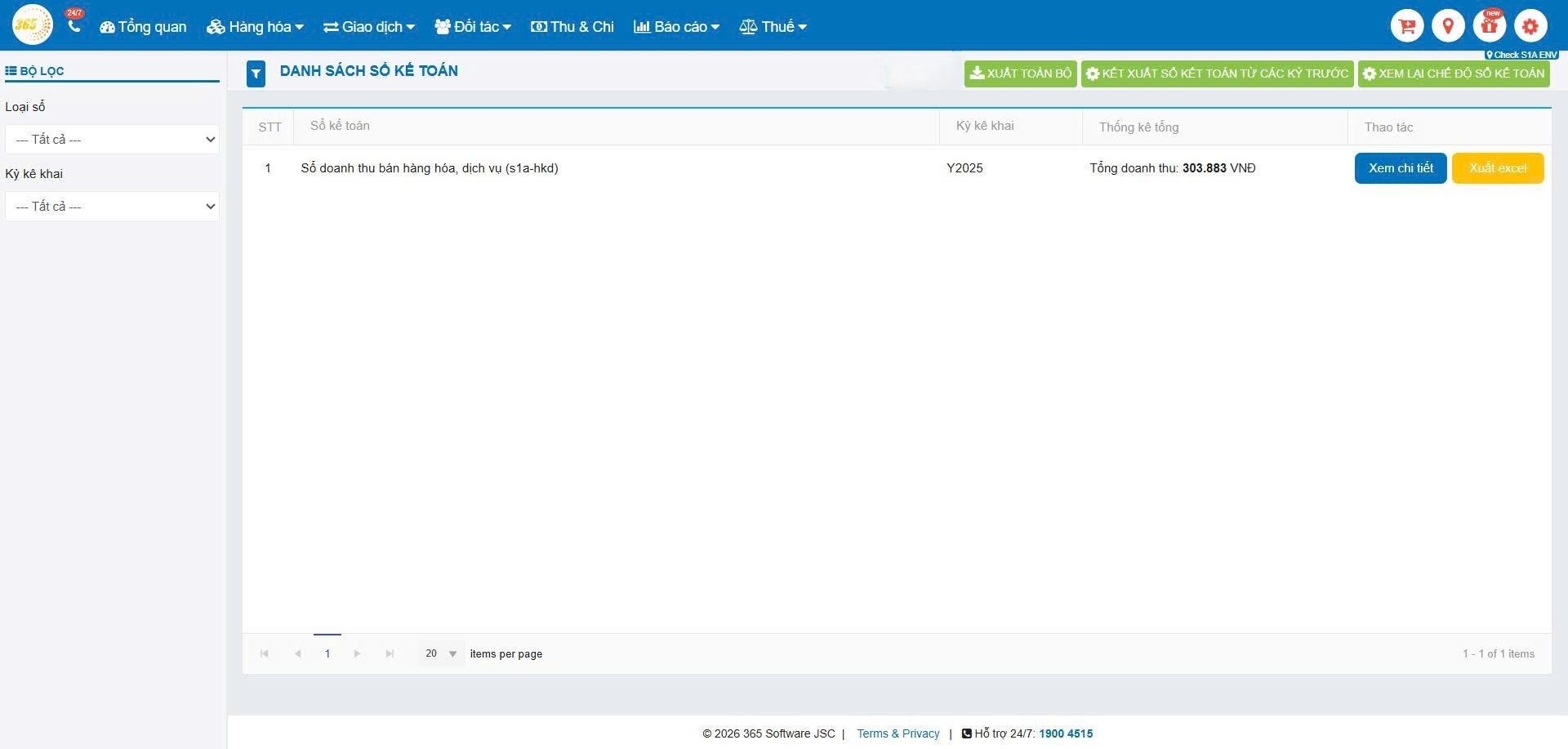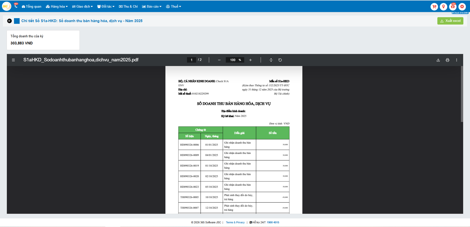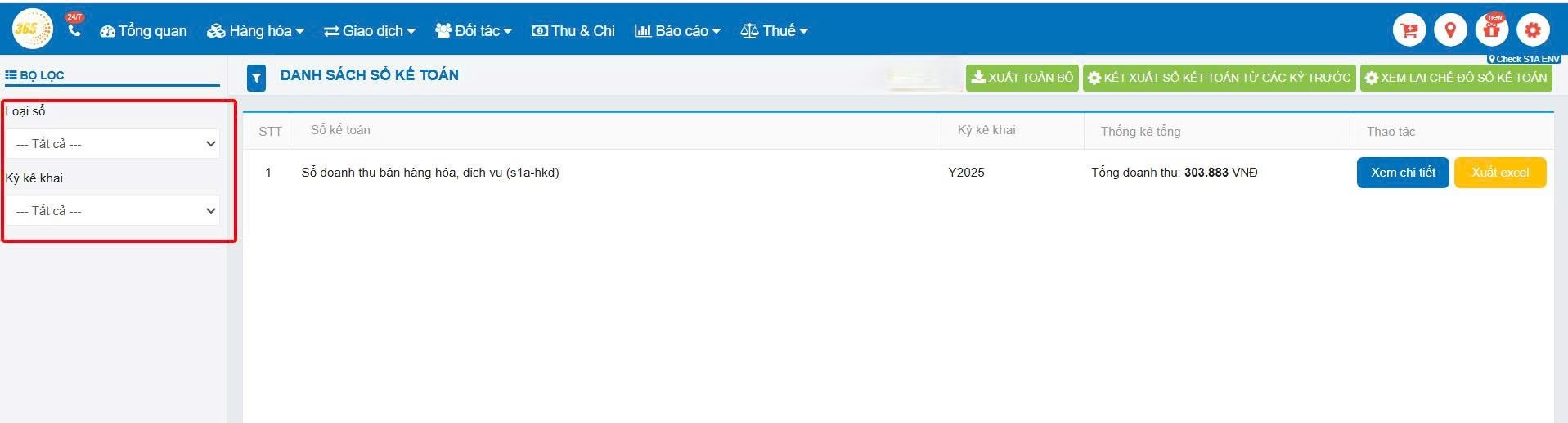 Lưu ý: Sổ S1a trên phần mềm POS365 sẽ tổng hợp số liệu theo từng chi nhánh (trong trường hợp hộ kinh doanh có nhiều điểm bán).