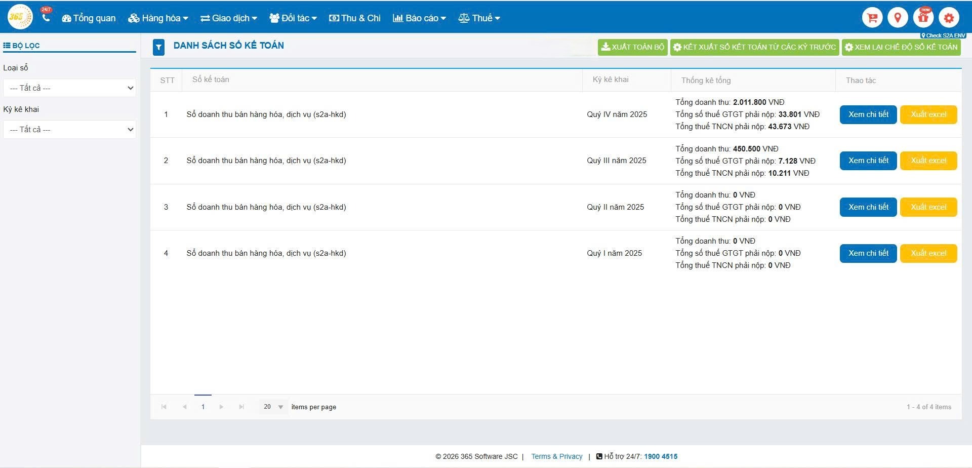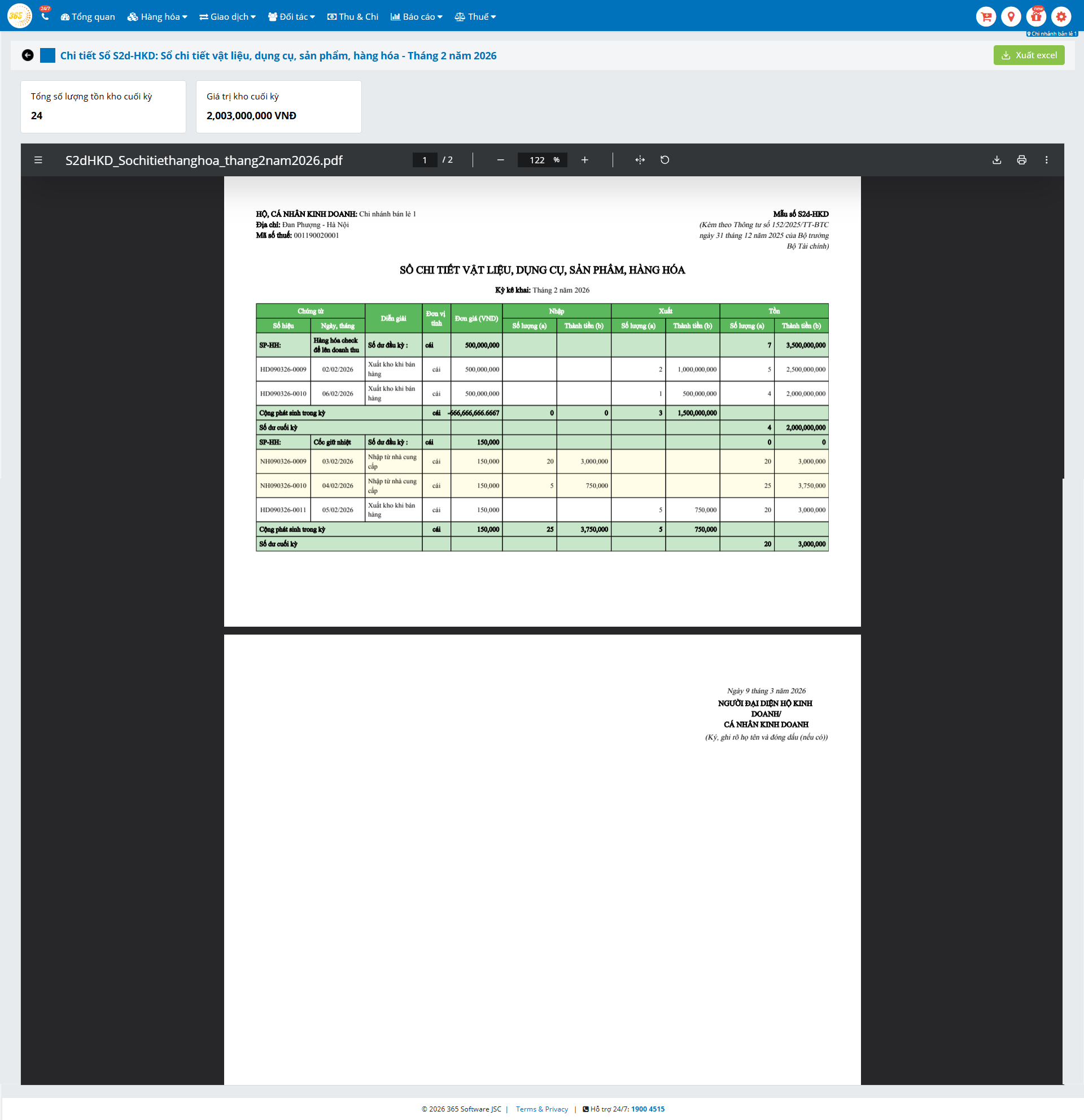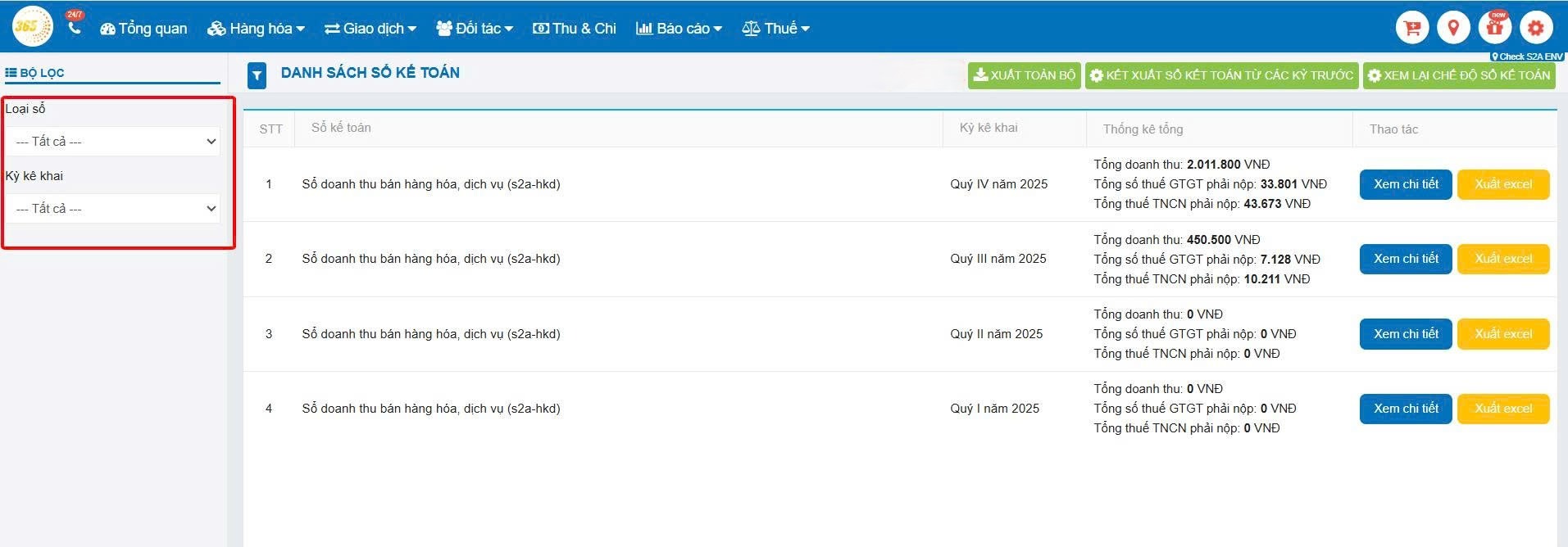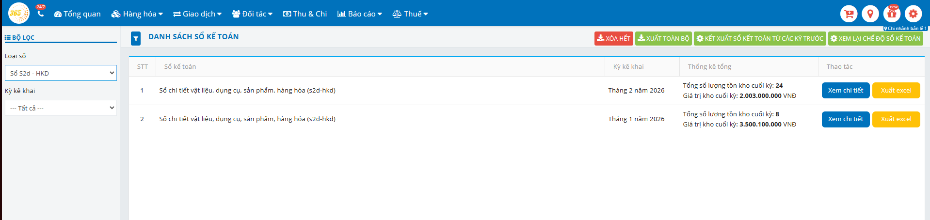 Lưu ý: Trên phần mềm POS365, sổ S2d sẽ tổng hợp số liệu theo từng chi nhánh nếu hộ kinh doanh có nhiều điểm kinh doanh.