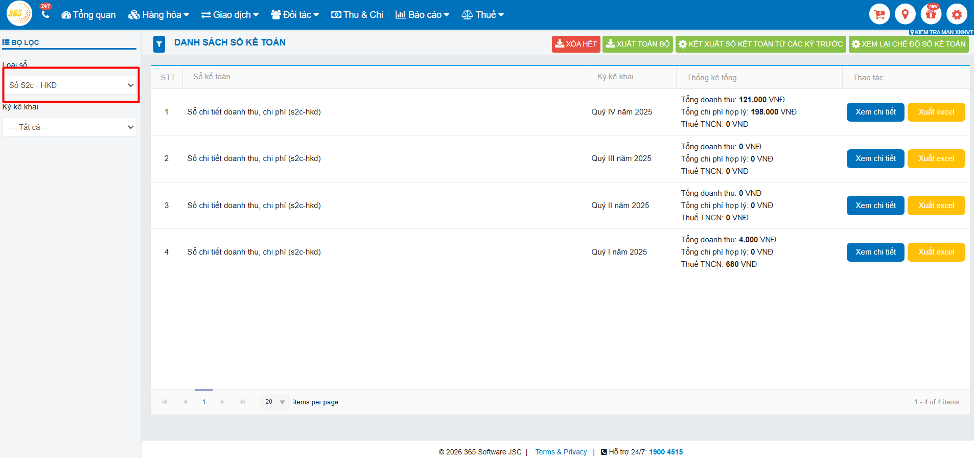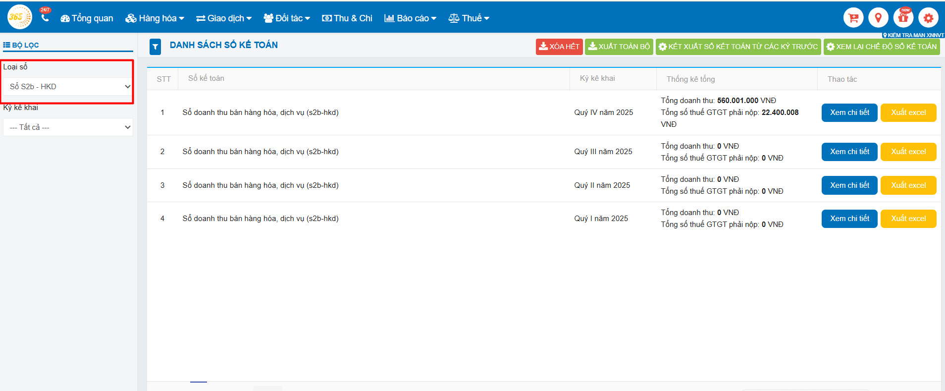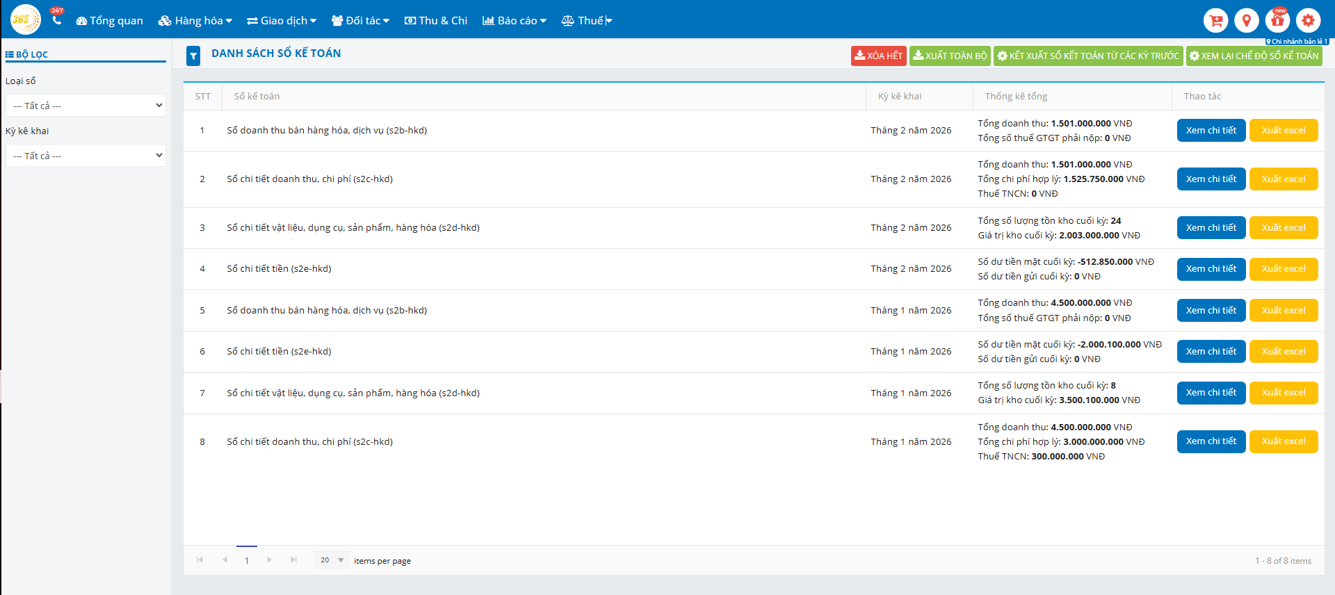 - Sổ kế toán sẽ kết xuất số liệu thống kê của từng chi nhánh (nếu HKD có nhiều chi nhánh trên hệ thống POS365).