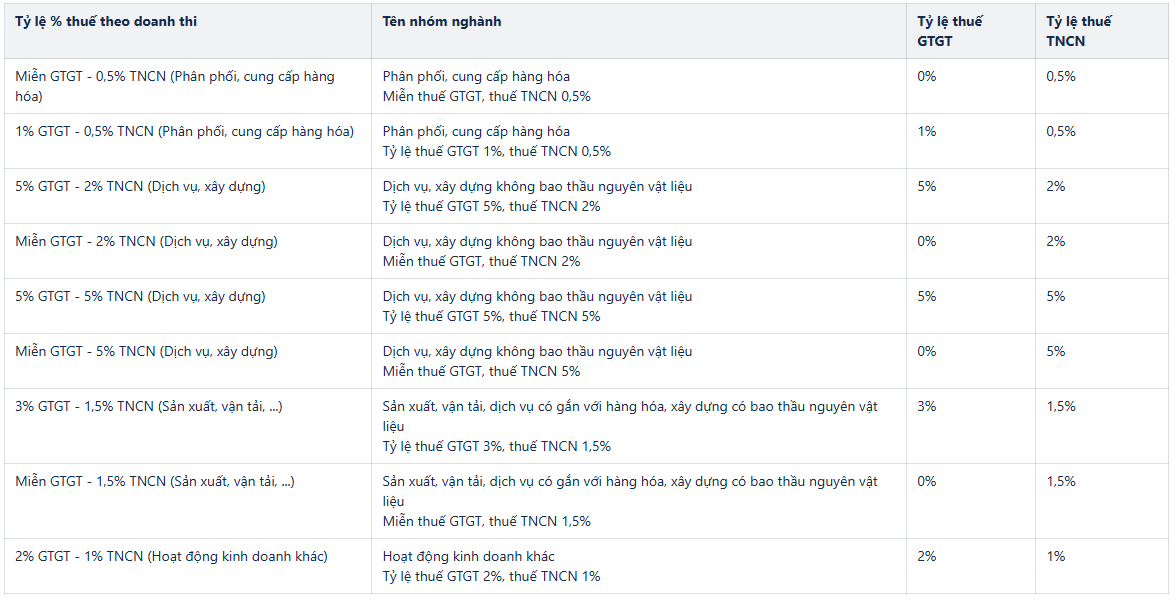 GTGT % doanh thu + TNCN trên thu nhập tính thuế |