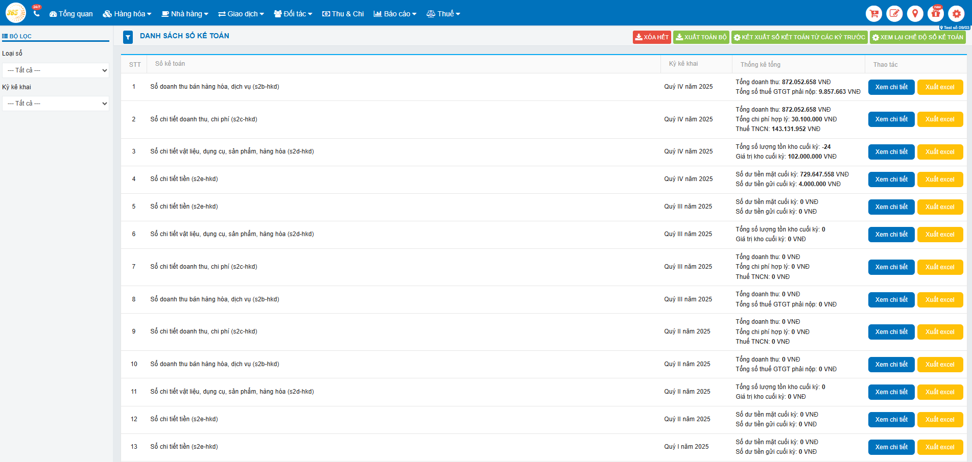 Hệ thống POS365 hiển thị màn hình Danh sách sổ kế toán.