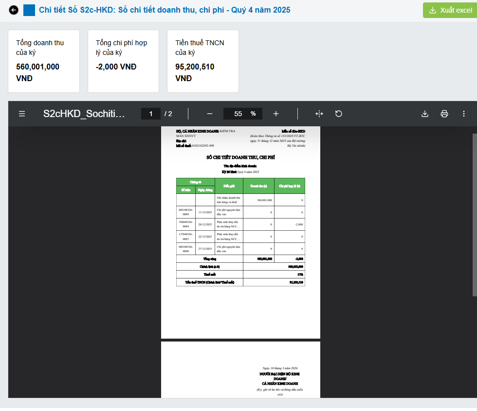 Trên màn hình chi tiết sổ S2c, nhấn Xuất excel để tải file excel của sổ kế toán này về máy.