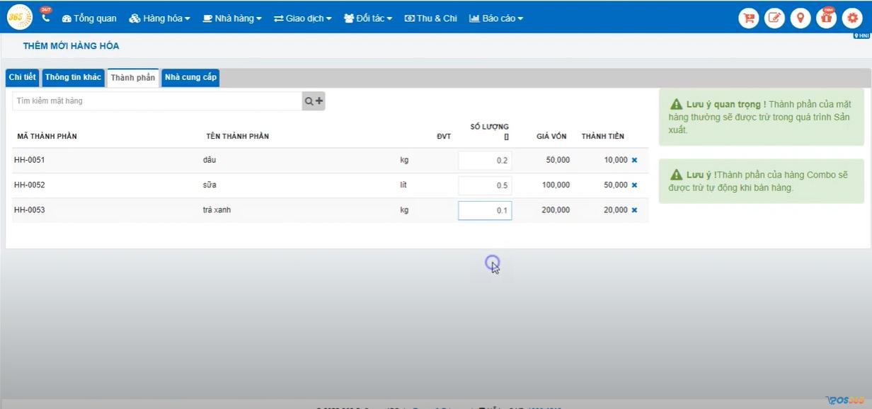 - Combo: Cũng là loại hàng hóa không có tồn kho, khi bán được 1 combo nào đó thì phần mềm sẽ trừ tồn kho của những mặt hàng tạo nên combo đó. Loại hàng hóa này phù hợp với những mô hình kinh doanh cần quản lý nguyên vật liệu như trà sữa, cafe, nhà hàng (Ngành FNB).
