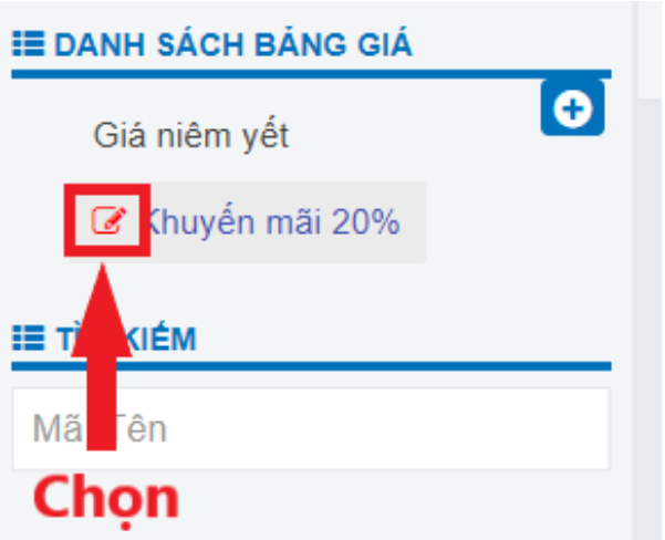 Tại giao diện Thiết lập bảng giá, lựa chọn danh sách bảng giá muốn cập nhật (VD: Chọn danh sách bảng giá "Khuyến mãi 20%"). Phía bên cạnh dòng chữ "Khuyến mãi 20%", các bạn sẽ thấy tính năng "Sửa" và chọn vào tính năng này.
