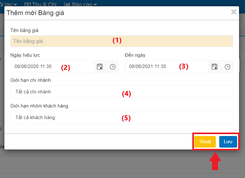 + Thoát: Chọn “Thoát” để hủy quá trình thêm mới bảng giá.