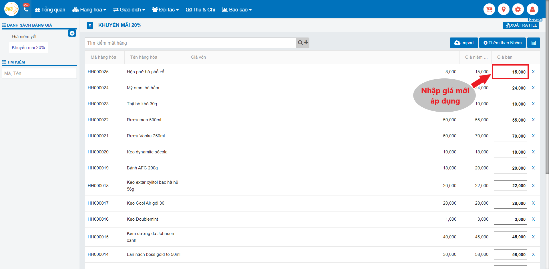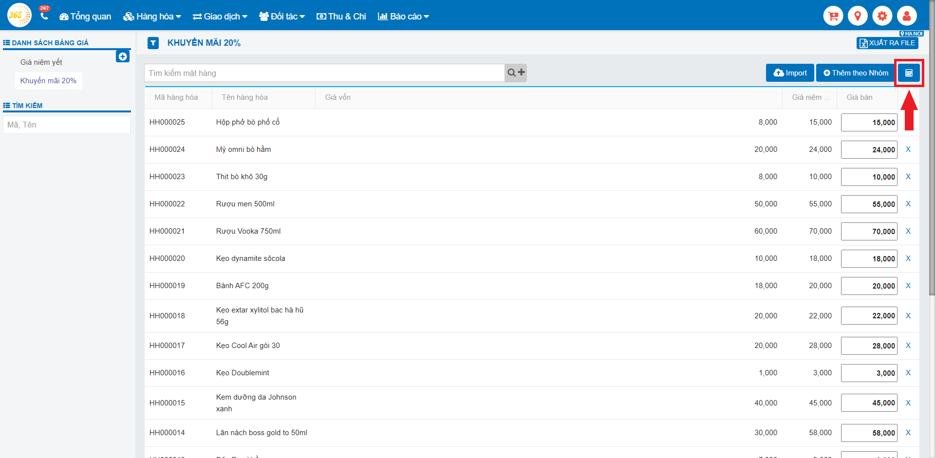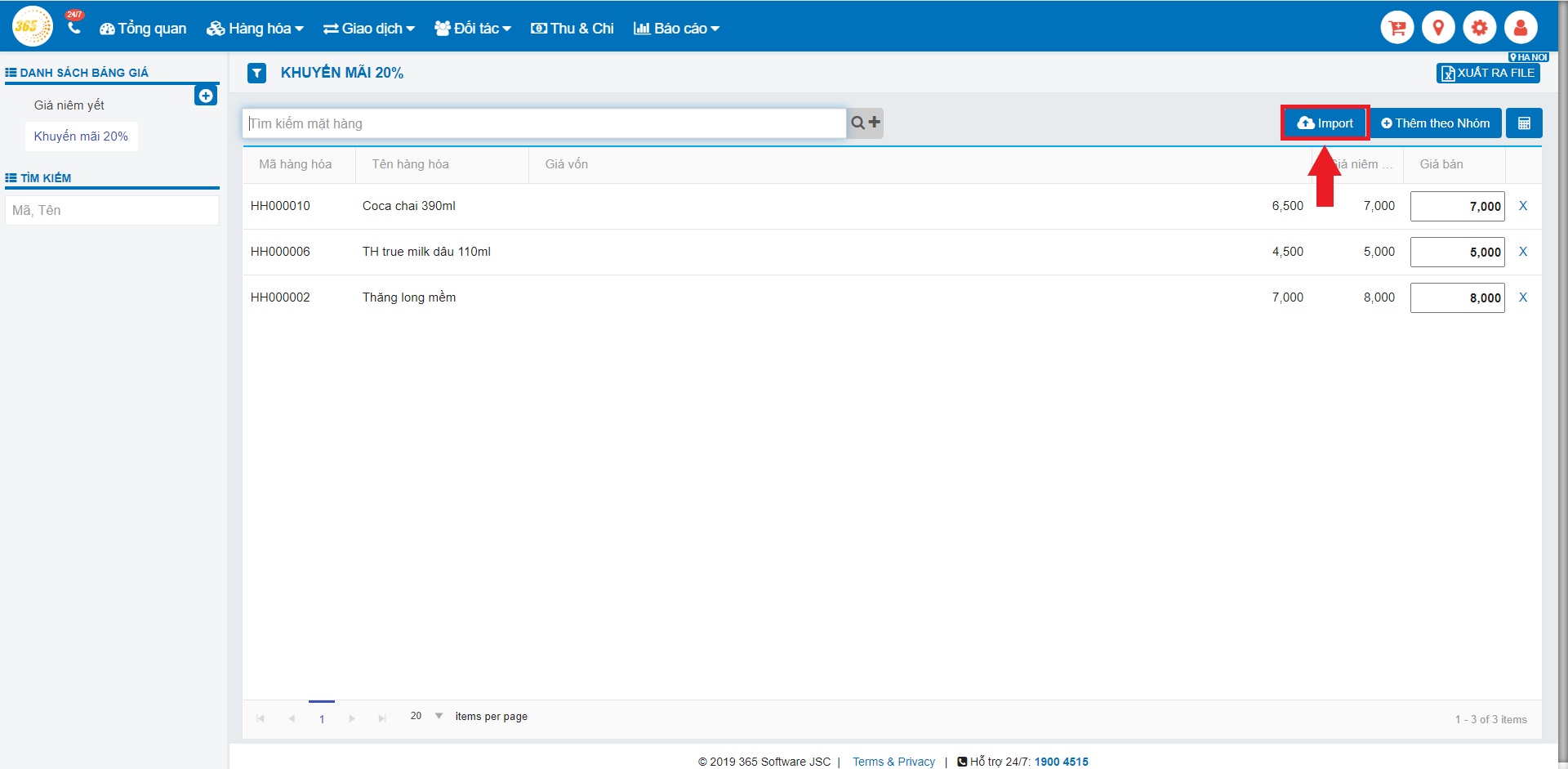 - "Import" nhiều hàng hóa cùng lúc: Lựa chọn Import trong bảng giá "Khuyến mãi 20%".