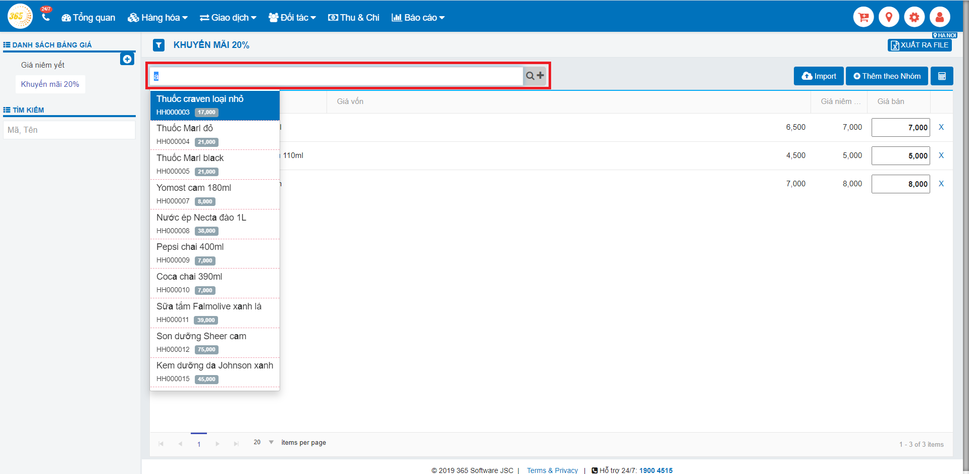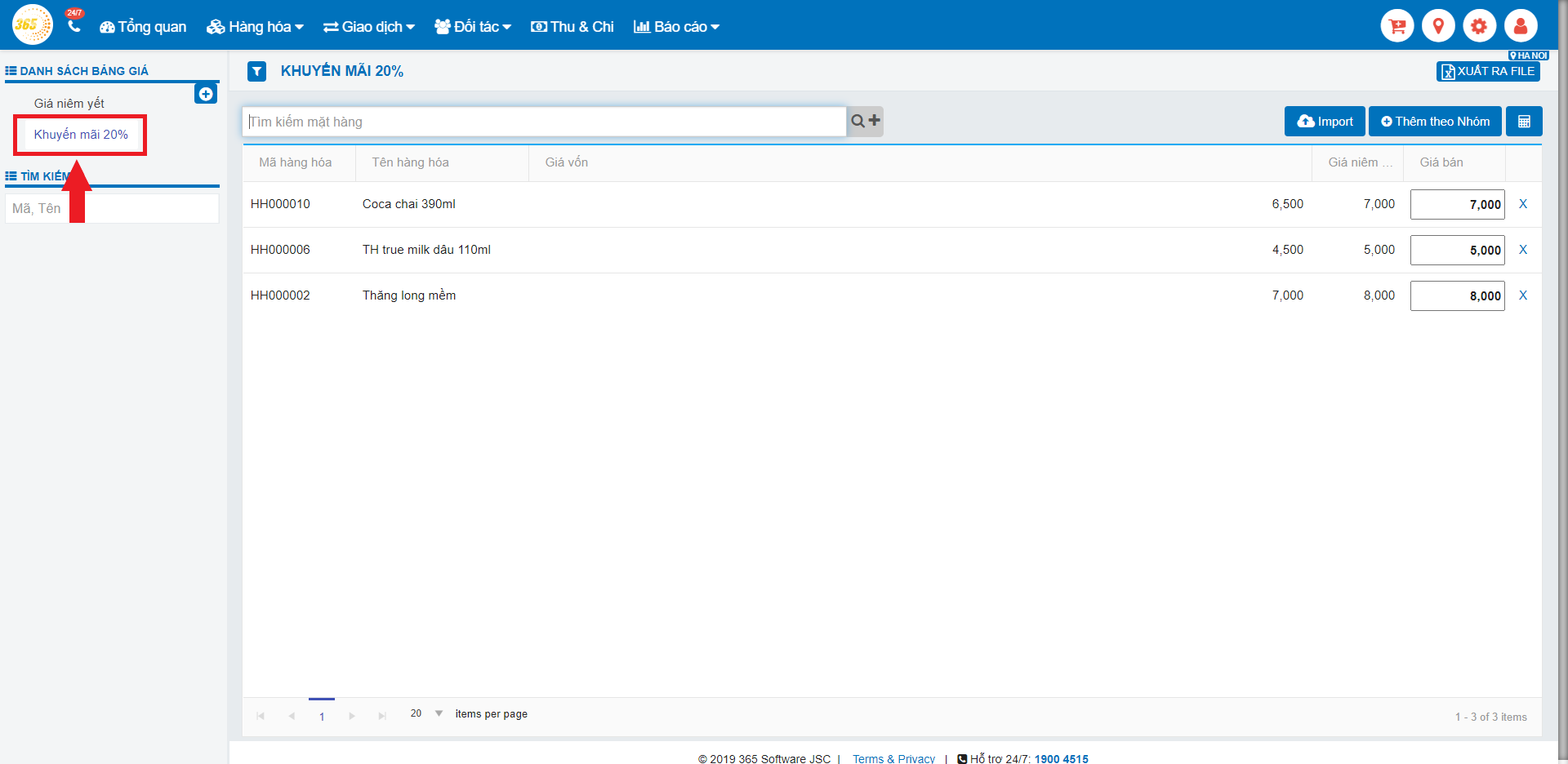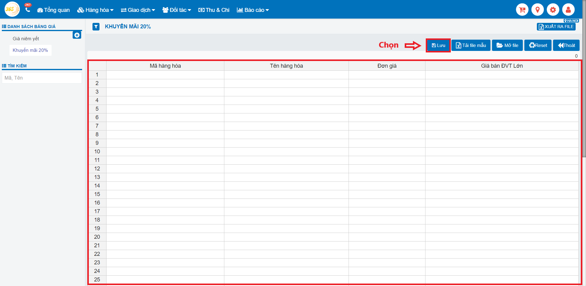 - "Import" nhiều hàng hóa cùng lúc: Lựa chọn Import trong bảng giá "Khuyến mãi 20%".