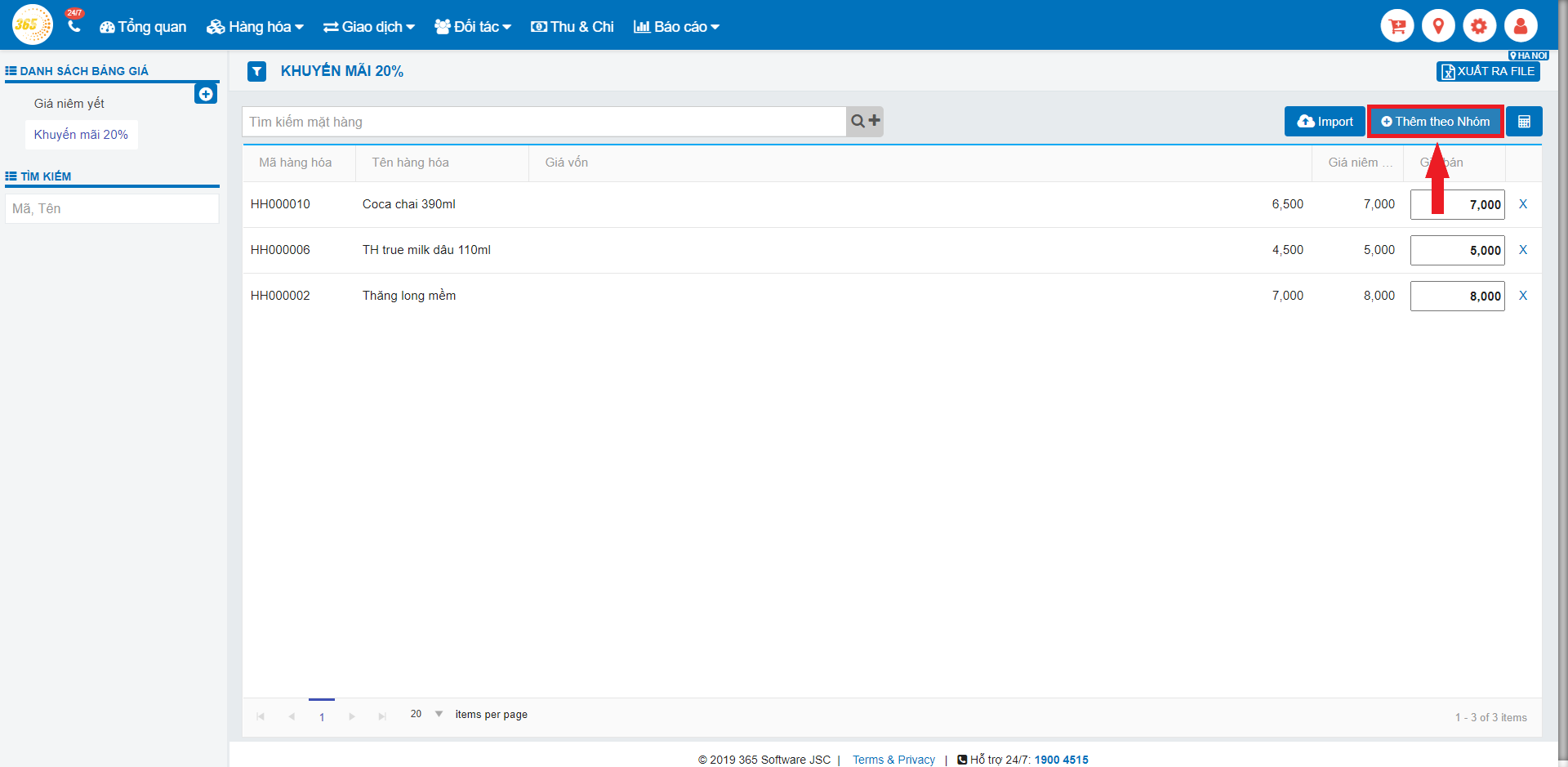 - Thêm theo nhóm: Tại giao diện bảng giá "Khuyến mãi 20%", các bạn chọn mục "Thêm theo nhóm".