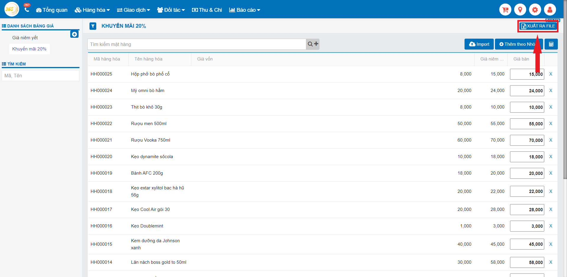 Tại màn hình Thiết lập bảng giá của bảng giá bất kỳ (VD: Chọn bảng giá "Khuyến mãi 20%"), chọn “Xuất ra file”. Hệ thống sẽ tự động xuất ra file excel bao gồm danh sách các hàng hóa có trong bảng giá "khuyến mãi 20%".